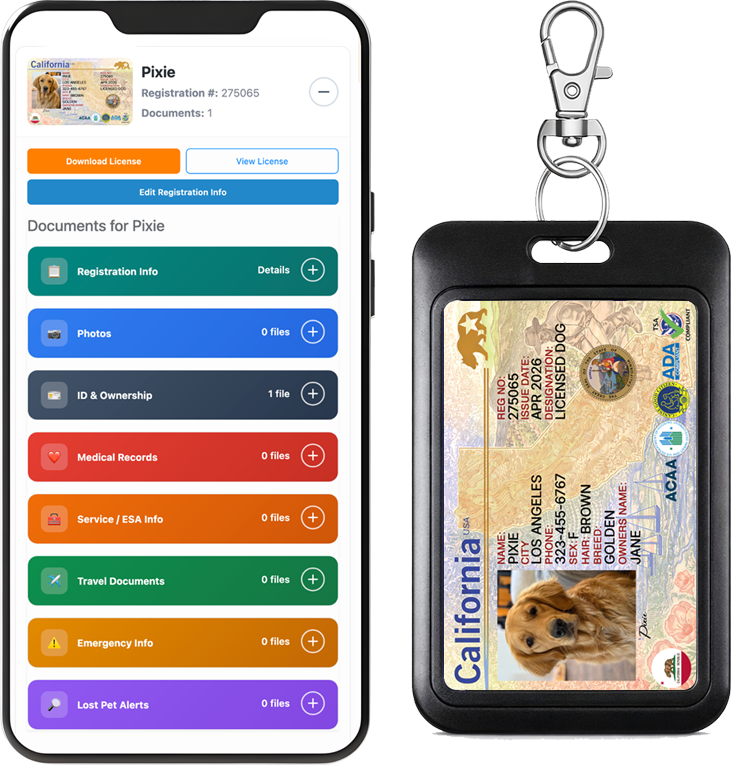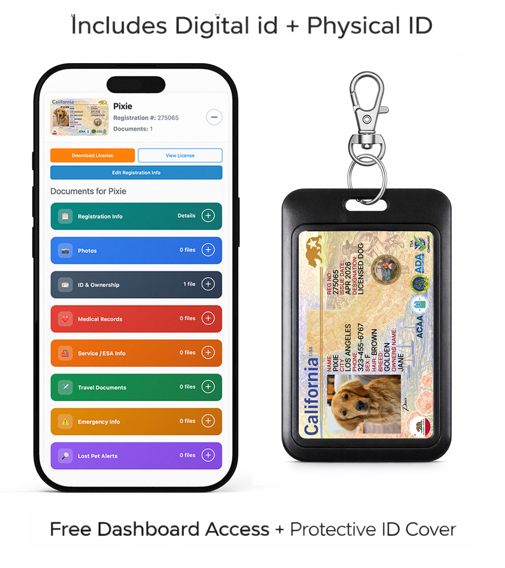 Create your dog’s complete ID system in minutes—featuring a premium wallet-style physical ID card plus a digital version on your phone for instant access to your dog’s documents wherever you go. No app required. Works on any smartphone or desktop.