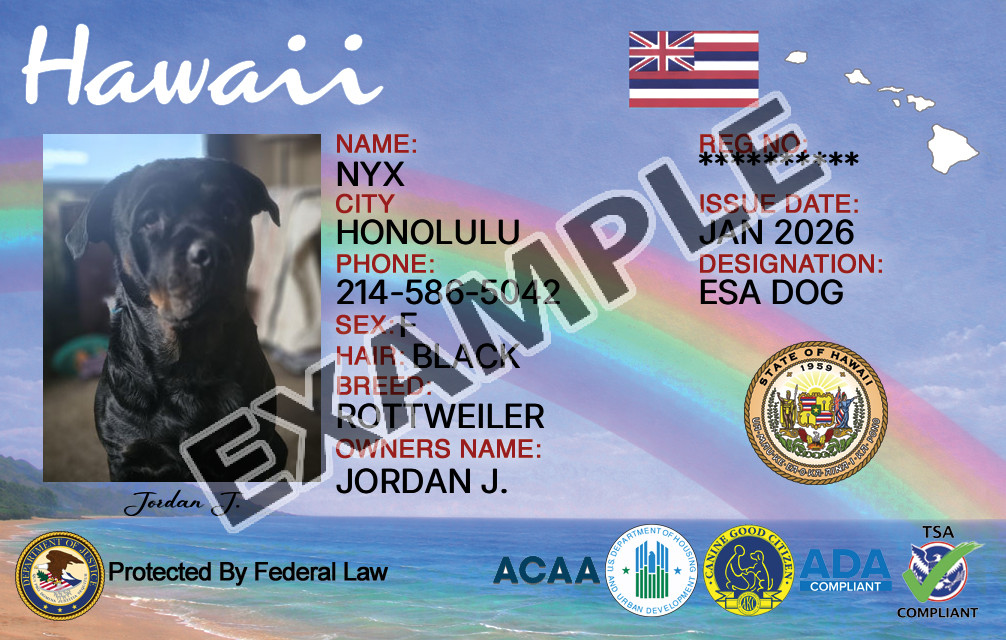 Your dog gets a high-quality, wallet-style ID card (plus a digital version for your phone), giving you both convenience and credibility wherever you go. Available in many designations, including service dogs, emotional support animals (ESA), and more.